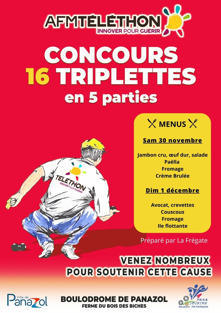 Les 2 concours du Téléthon/Pana-loisirs à la ferme du bois des biches des 30/11 et 01/12/2024 affichent complet. Rendez-vous pour le jet du but à 9h00 à la ferme du bois des biches. En route pour espérer un nouveau record ?
